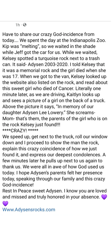 I found Adysen’s rock on the bike trail near Westside Christian In Springfield, IL. I walk and run that trail almost everyday and this is when I like to pray. It’s so peaceful and I feel Gods presence more when I’m in nature. Today I was walking and praying and asking God for some direction and help on something That has been a challenge for me for a long time. Anyway, Seconds after I asked God to show up in my life, he did! Just then looked up and noticed Adysen’s rock on the railing. It was my favorite color and that’s what caught my eye. My daughters name is also Addison :) I read your website about your Adysen and was touched. She seems like such an amazing girl with so much talent and a love of life. It’s so heartbreaking that her life was taken way too soon. Adysen rocks is a beautiful and creative way to keep her spirit alive all over the world. My heart goes out to Adysen’s family. I thank you for letting the world learn about her and her amazing life..